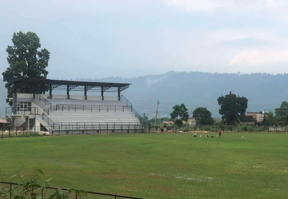 मैदानको ग्रीन आउटफिल्ड सजिएको छ, पृष्ठभूमिमा पहाड र हरियालीले दृश्यलाई अझ रमणीय बनाएको छ ।