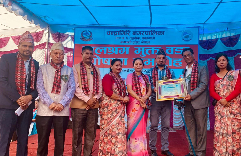 चन्द्रागिरि नगर प्रमुख गिरीले आइतबार आयोजित कार्यक्रममा चन्द्रागिरि–१ लाई ‘बाल श्रममुक्त वडा घोषणा’ गर्दै बाल श्रम निवारणका लागि नगरपालिकाले उच्च प्राथमिकता दिँदै आएको जानकारी दिए । उनले घोषणा पछिको दिगोपनमा काम गर्न आग्रह गरे । बालमैत्री नगर घोषणाका लागि प्रारम्भिक चरणमा विभिन्न सूचक पूरा गरी वडालाई बाल श्रममुक्त बनाउँदै लगिएको उनले जानकारी दिए ।