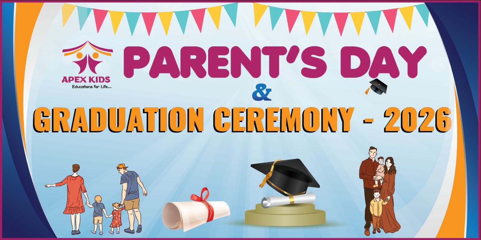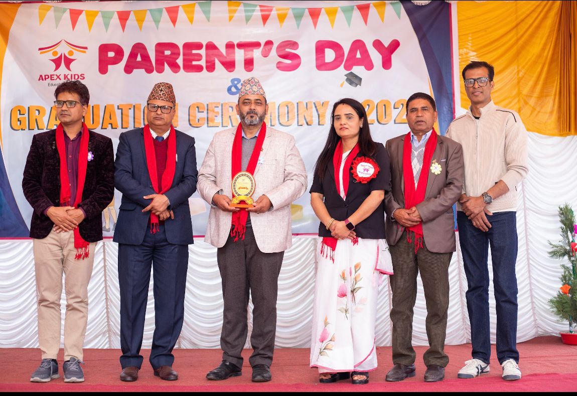 काठमाडौं, चैत १४ ।Apex Kids द्वारा आयोजित अभिभावक दिवस तथा दीक्षान्त समारोह शनिबार भव्य रूपमा सम्पन्न भएको छ। उक्त कार्यक्रममा विभिन्न कक्षाका बालबालिकाले नृत्य, कविता, भाषण तथा सिर्जनात्मक प्रस्तुति मार्फत आफ्नो प्रतिभा प्रस्तुत गरेका थिए।कार्यक्रमको सुरुवात LKG तथा UKG का बालिकाहरूको स्वागत गीत “स्वागतम्” बाट गरिएको थियो। त्यसपछि PG कक्षाका बालबालिकाले “मा सानी चरी” कविता प्रस्तुत गर्दै अभिभावकहरुको मन जितेका थिए।