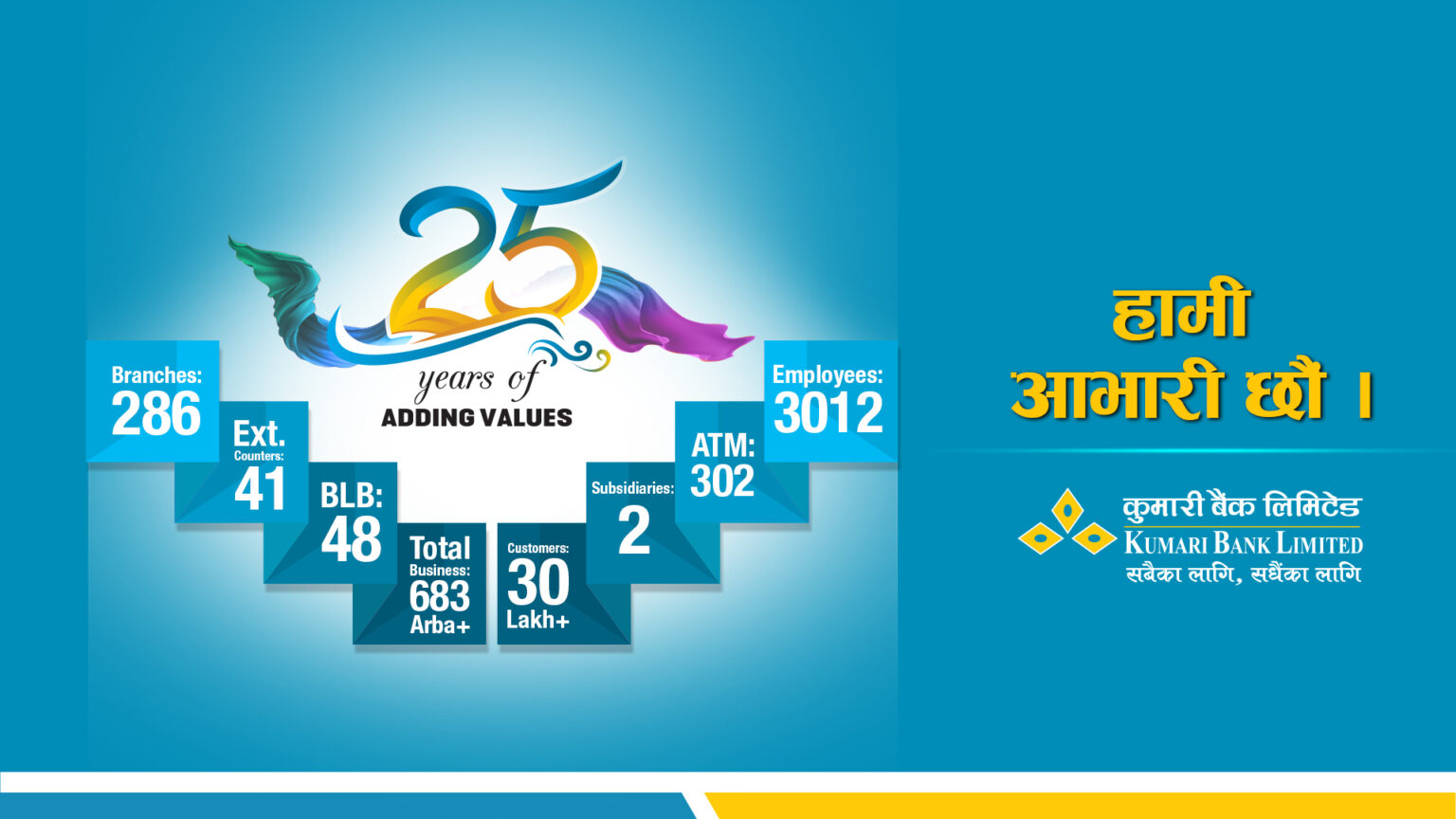 यस वार्षिकोत्सवको अवसरमा कुमारी बैंक लिमिटेडले आफ्ना सम्पूर्ण ग्राहक वर्ग, शेयरधनी, नियामक निकाय तथा शुभचिन्तकहरुलाई कृतज्ञता ज्ञापन गर्दै आफ्नो सफलतामा महत्वपूर्ण भूमिका निर्वाह गर्ने सम्पूर्ण ग्राहकवर्गहरुको सहयोग तथा विश्वासप्रति हार्दिक आभार व्यक्त गरेको छ । कुमारी बैंक देशकै अग्रणी बैंक बन्ने आफ्नो परिकल्पना तथा योजना अनुरुप आफ्ना ग्राहकहरुलाई उत्कृष्ट बैंकिङ्ग सेवा तथा वित्तीय सुविधाहरु प्रवाह गर्नका लागि हरदम प्रतिबद्ध छ ।